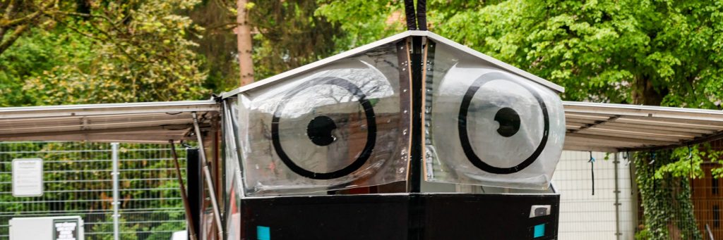Am Freitag, dem 5. Mai rollte das ungewöhnliche Gefährt auf den Schulhof: ein von einem Elektroauto gezogenes fahrendes Haus. Das spannende daran ist, dass das Haus, sobald es parkt, seine Flügel in Form einiger Solarmodule ausklappen kann. Und mit der eingefangenen Sonnenenergie kann es nicht nur das Haus selbst mit Energie versorgen, sondern auch noch das Auto, das das Haus zieht, auftanken.