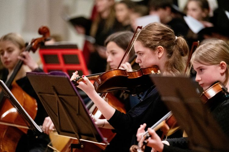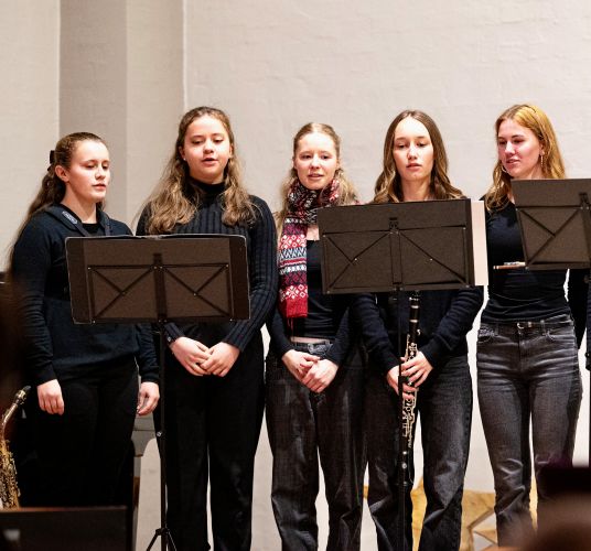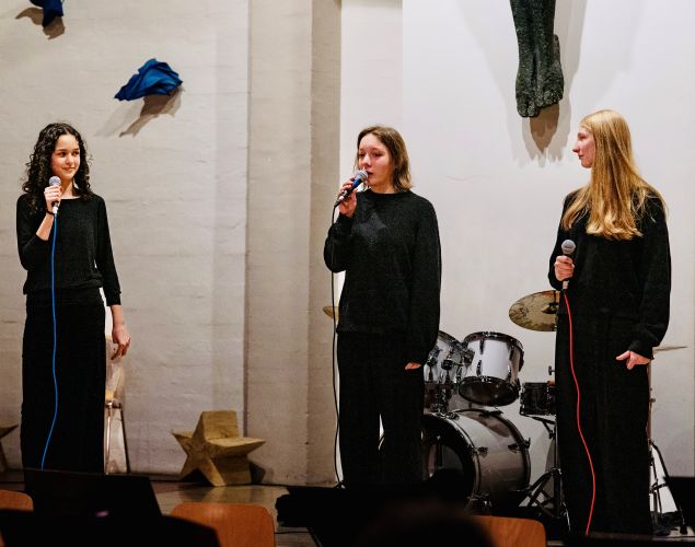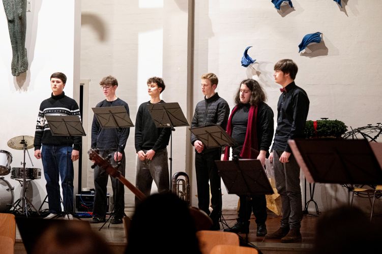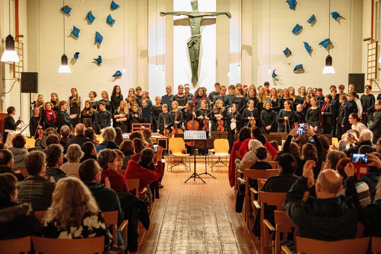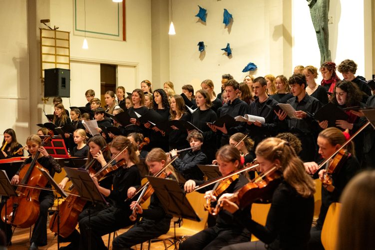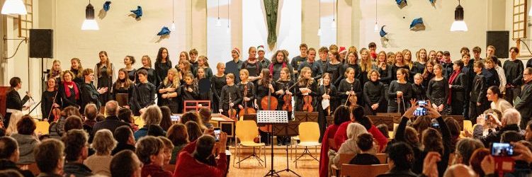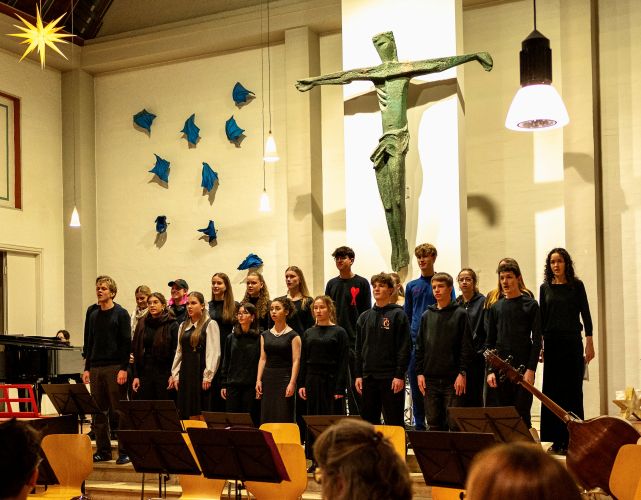 Aufgetreten sind der Musik-Basiskurs K1 mit einem auf deren Instrumente und Stimmen zugeschnittenen Arrangement, dann ein Projektchor der zehnten Klassen mit Gesang aus mehrstimmiger Filmmusik, ein solistisches Sopranlied, traditionell die BGees als Lehrer-Ensemble, und schließlich hörten wir als anspruchsvolles Werk mit großartiger Chor- und Orchesterbesetzung und darin verwobenen Sologruppenpartien die „Messe de Minuit pour Noël“ von Marc-Antoine Charpentier. Diese Musik hat allen viel abverlangt, und die intensive Probenzeit in den Monaten davor hat sich hörbar und für alle spürbar gelohnt.